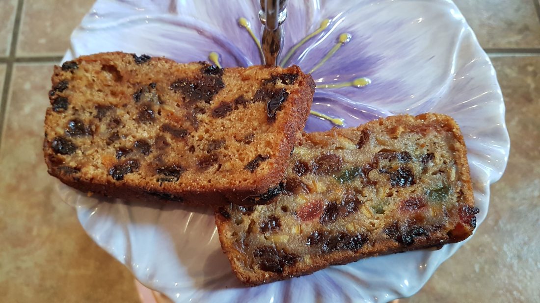 The loaf did not quite turn out as planned. Due to the fact that the green and red cherries are not dried but rather hydrated, the mixture was too wet and the cake took a long time to bake. He tasted both halves of the fruitcake and told me that he actually loved the original recipe (left in the picture), but didn’t like my modified version (right in the picture) because it ended up being very tough and dry. The lesson here is to follow the original recipe if you have never made it before, and then try and make modifications if necessary.
