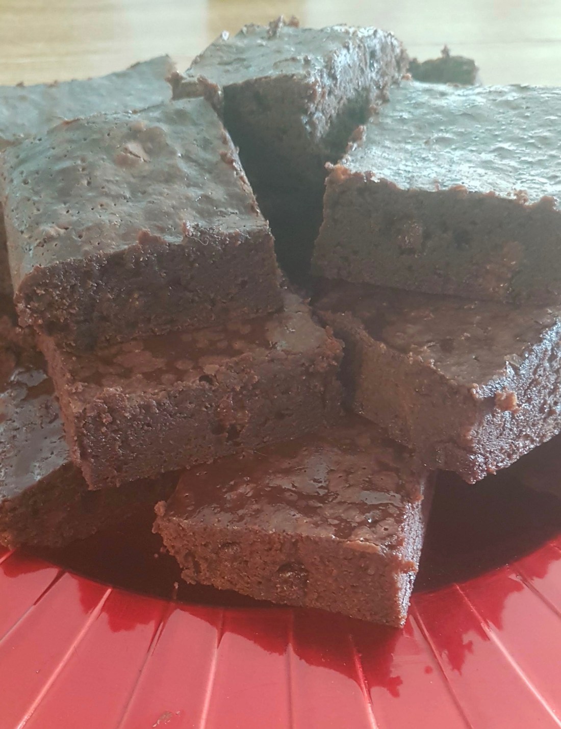 - Scrape the batter into the prepared pan and spread evenly. Bake for about 30-35 minutes, until a toothpick inserted in the centre of the brownies comes out clean. Cool to room temperature.