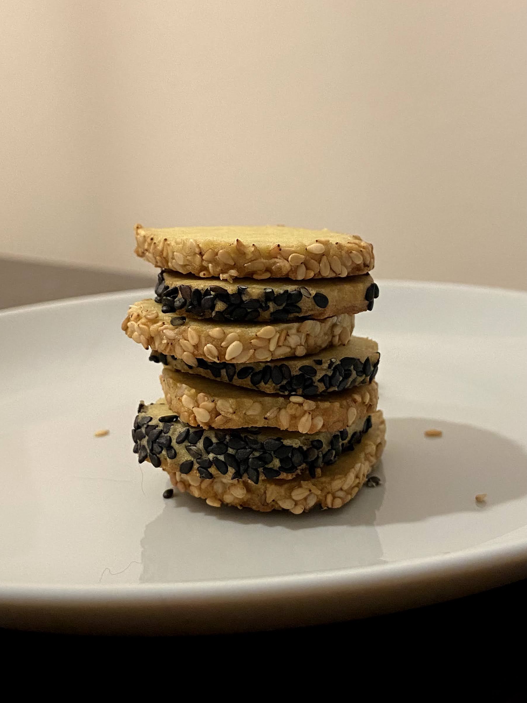 These cookies turned out lovely and taste good. I was expecting more of a kick from the ginger I must say, and I wouldn’t have minded a bit more matcha flavour to come through, but they are nonetheless tasty and make for a perfect little evening snack to go with tea. They look particularly pretty with the green tea colour and the sesame coating around the edge. I just so happened to have both black and the classic white sesame seeds so I used both and I think this looked quite pleasing, but it is definitely not necessary. Cute little cookies!