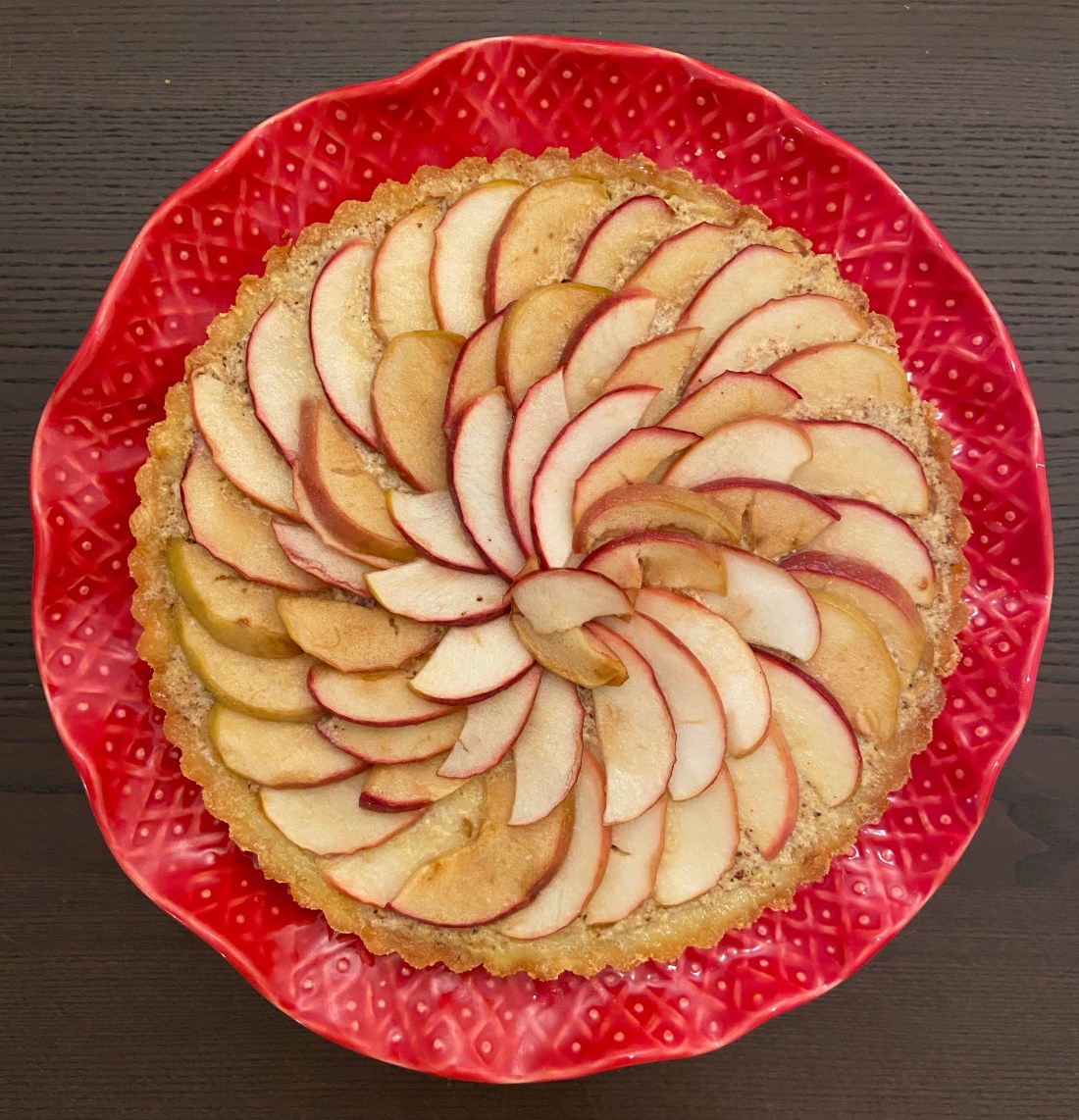 Everything went smoothly while making this recipe, although I do recommend using half an extra apple to make sure that you have enough slices to make a pretty pattern on the top of your tart. I ran out of intact, nice apple slices at the end of my pattern, which is where you can see lighter apple slices in the center where I had to quickly cut some more that had not soaked in Marsala wine like the others. It did not change the texture of those apples, just the colour and perhaps slightly the taste. I also recommend making sure that you have a bar or square of bittersweet chocolate, and not just chocolate chips like I had to use when I realized that’s all I had. Let me tell you that it is not simple to grate chocolate chips! In any case, I made it work, completed the pie and let it rest at room temperature. I only had a small slice to taste since I was brining the rest to work, and I frankly wasn’t sure what to think of it. It tastes nice, but it is not very sweet. That’s not bad per se and you might really like it if you enjoy desserts that are less sweet, but for me I prefer desserts to be a little bit sweeter than that. I think I was also not convinced by the combination of cheese, chocolate and apples in this dessert. Perhaps if I had a bigger or another piece I would have gotten used to the taste and the combination a bit more. Nonetheless, the textures were pleasant and my colleagues seemed to enjoy it.
