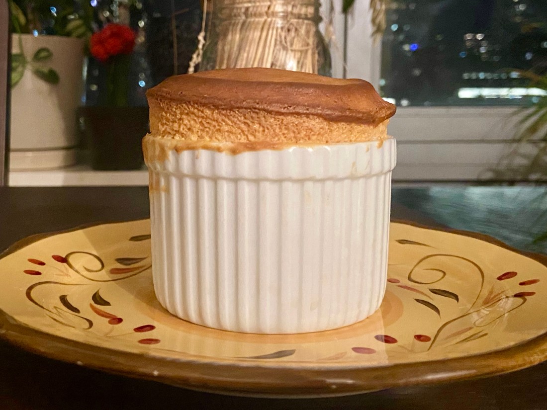 I followed the recipe as is and this time used the proper soufflé baking dishes that are big enough to contain the batter and allow for a good rise, and to my great surprise it was a successful attempt. Third time’s the charm as they say. It was very difficult to resist opening the oven to sneak a peak at my soufflés, but I did quickly turn on the oven light to take a look near the 10-minute mark and they had risen so much! It looked like that had risen by an inch. I was very excited. When I took them out they were still looking perfectly cute and so I quickly served them before they deflated. Indeed, it did not take much time for them to start slowly deflating with the cooler room temperature air. Even with the brief time it took me to snap a picture or two, they were deflating during the process.