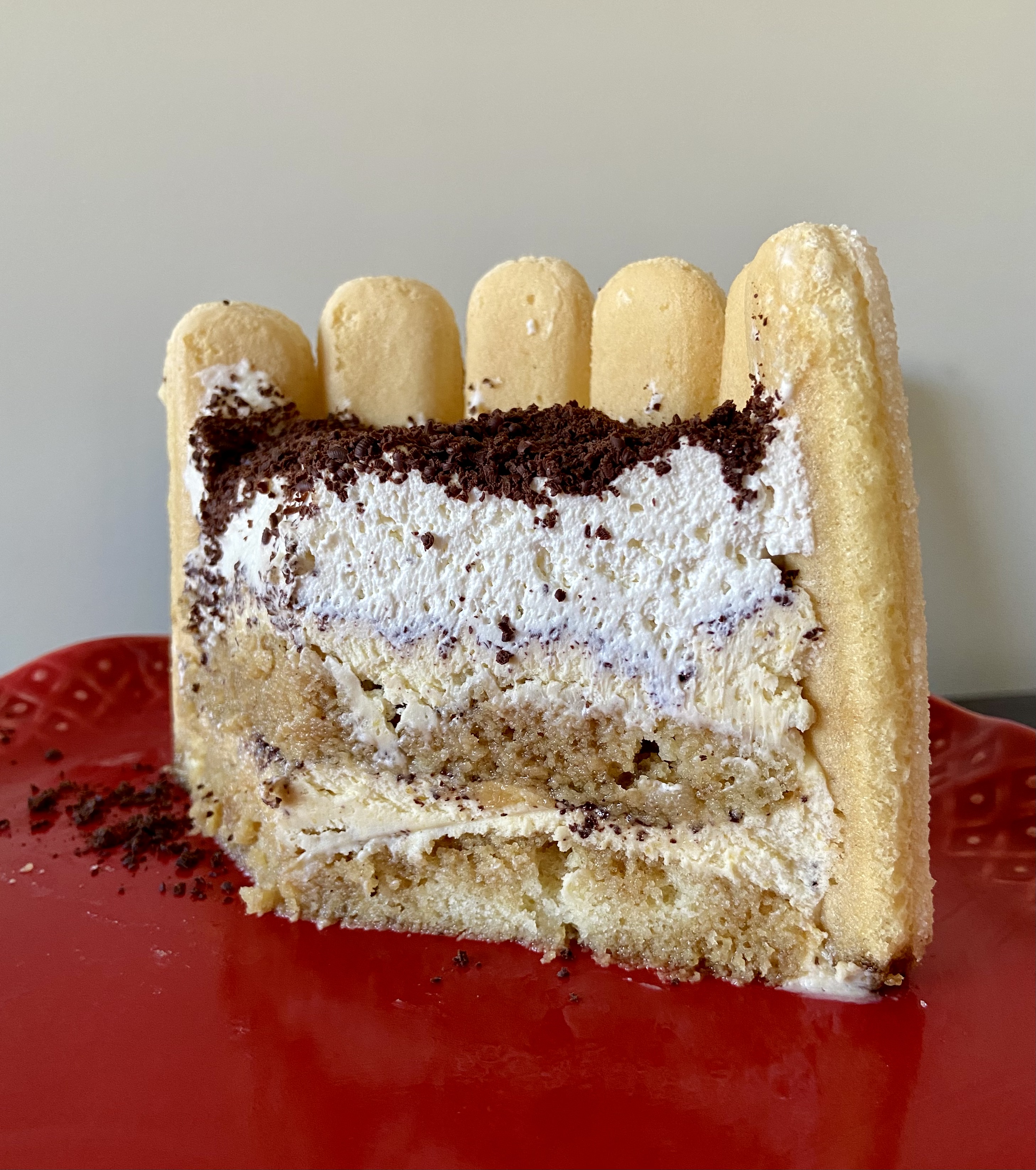 - To assemble the torte, slice the vanilla cake layer horizontally and place one 8-inch cake layer in the bottom of a 9-inch springform pan. Arrange the ladyfingers around the outside of this cake layer (the cake willl help to keep them in place). Brush the cake layer with half of the coffee syrup, and then spread half of the mascarpone filling over the cake. Sprinkle a layer of grated chocolate over the filling and top with the remaining cake layer. Brush this with the remaining syrup, top with the remaining mascarpone cream, and sprinkle this with more grated chocolate. Cover the torte loosely and chill until set, about 4 hours.