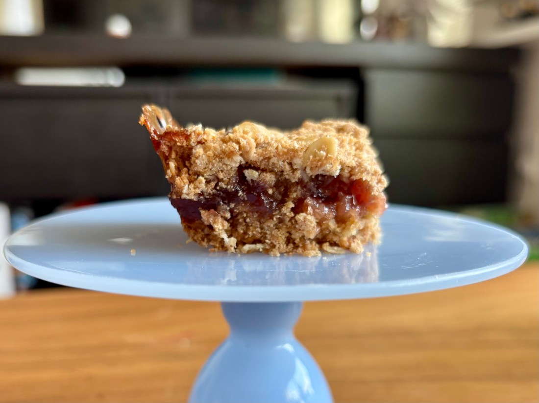 I enjoyed making these oat bars, but they didn’t turn out quite right for me. The oat mixture was much too crumbly and not wet enough. It was evident as I was pressing it into the pan and atop the strawberry preserves that it was not wet enough and I suspected, correctly, that it would not hold it’s shape much. I don’t know if it’s the specific almond butter that I used that perhaps was a different consistency and moisture, but I’d guess that a bit more of this or perhaps orange juice would have helped. In addition, although the bars were tasty, it is really the strawberry preserves that shine through as I did not detect much almond flavour myself. They were still pleasant to eat and they do not feel too heavy, but I do wish that the crumble held more it’s shape.