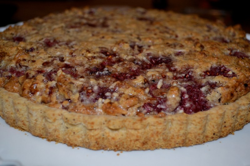After several months of not posting any new recipes from Anna’s cookbook, I decided that it was time to remedy this! I “owed” my boyfriend two cakes due to two lost bets, and as per his request I made this delicious-looking raspberry and pecan tart, two of his favourite foods. I was happy to finally have a recipe to do and a dessert to make, and it was no trouble at all to do. I am typically not a fantastic dough maker, but since I had already made the nut-crust tart shell required for this recipe, I new what to improve.
